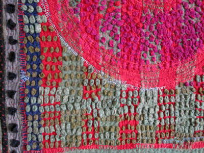 The circular wound was mended (and strengthened) with blanket stitch. Stitched into it were small squares of folded wool to represent the repeated daily chores. Finally, the whole thing was drowned in the washing machine and transformed into something tougher as it became felted.